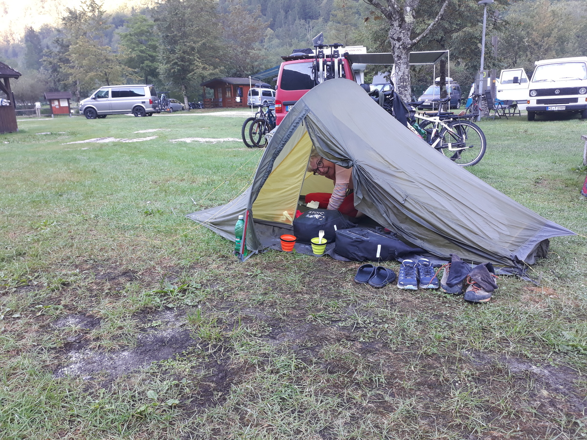 Ker sva z Darjo Gorenjski del Slovenske turne kolesarske poti (STKP) že večinoma prekolesarila, sva se tokrat odločila izkoristiti lepo vreme in se odpeljati v Soško dolino. Kar nekaj časa sva po internetu pregledovala različne možnosti prenočevanja, vendar razmere niso bile posebno obetavne - videti je bilo, da bi lahko dobila prenočišče le za nespodobno visoko ceno. Zato sva se odločila vzeti s seboj šotor z vso potrebno opremo. Kljub temu, da je najin šotorček res lahek in naj bi po napovedih bilo toplo vreme, so torbe postale precej težke - vsak sva vozila kar 12 kg prtljage.