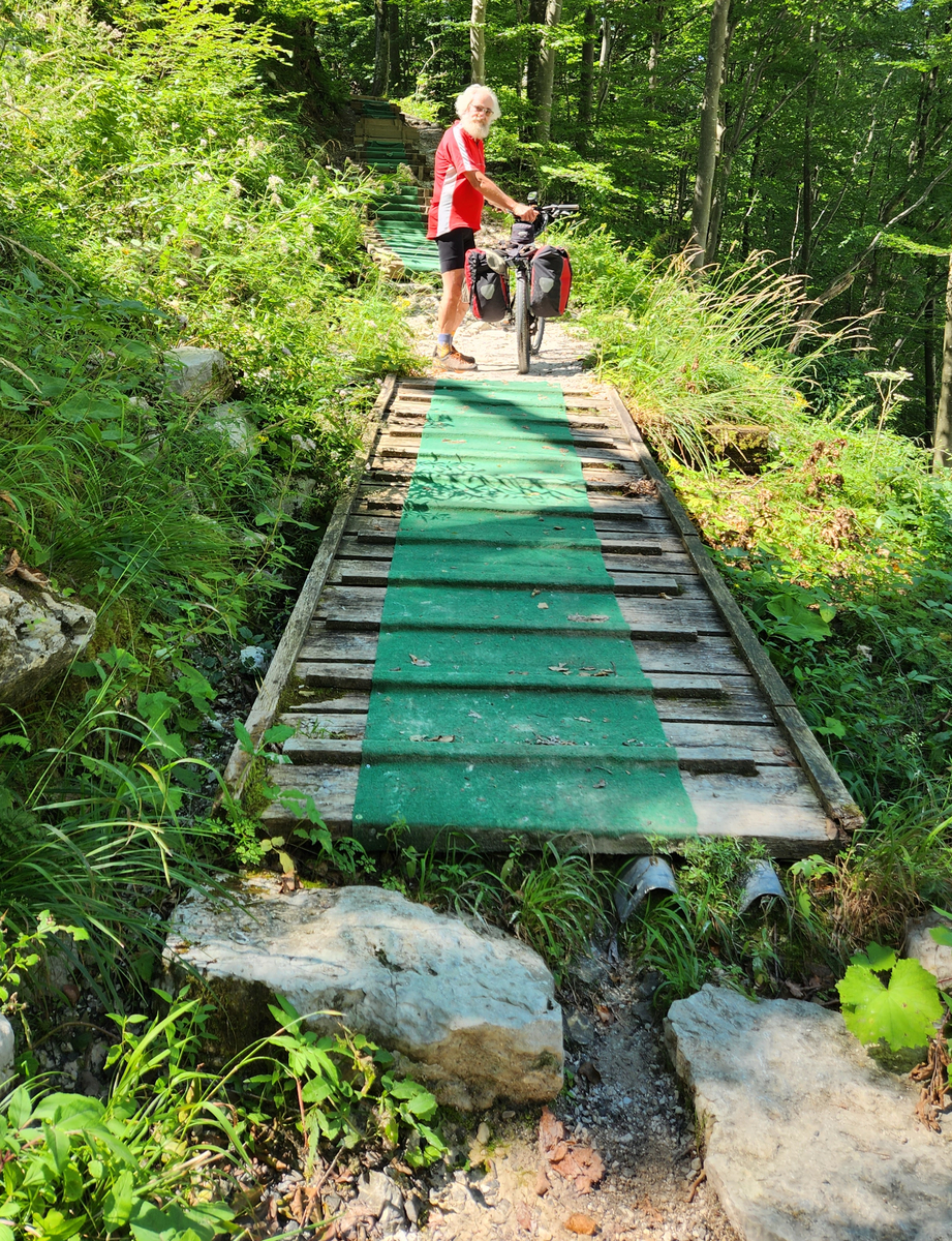 Pot sva nadaljevala po levi strani Soče. Cesta je postala kolovoz in še ta močno razrit. Pri mostu Lipuc pa naju je presenetila tabla, da je naprej pot zaprta. Ni kaj, temu morava verjeti, najbrž je neurje res odneslo pot. Zato spraviva kolesi po stopnicah do visečega mostu in na drugi strani zopet navzgor. Z vso prtljago je bila to kar lepa telovadba. Na drugi strani mostu so se potrudili in lesene stopnice prekrili z manj drsečo oblogo. Na desni breg Soče sva tako prišla po preprogi. Sledila je vožnja po glavni cesti vse do Trnovega, kjer sva se preko naslednjega visečega mostu lahko vrnila na levo stran reke. Pot se je počasi dvigala in naju končno pripeljala v Drežnico. Od tam sva se po cesti spustila proti Kobaridu in se nato peljala še vedno po levi strani Soče do Tolmina. Pozno popoldne sva postavila šotor v kampu Labrca, skoraj ob Soči. Po osvežitvi v reki odkolesariva na večerjo v gostilno na začetku Tolmina, saj je restavracija v kampu zaprta. Turistov v soški dolini je veliko, a je videti, da turizem tu precej šepa.