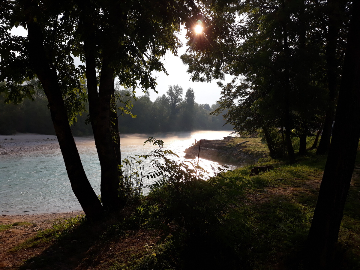 Naslednje jutro pa zajtrka res ni bilo, saj zjutraj kuhinja ne dela. Zato sva se hitro odpeljala po levi strani Soče navzdol do Čezsoče. Prva gostilna je bila dopoldne zaprta in šele tik pred Bovcem sva uspela dobiti kavo in sveže rogljičke.