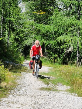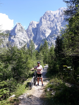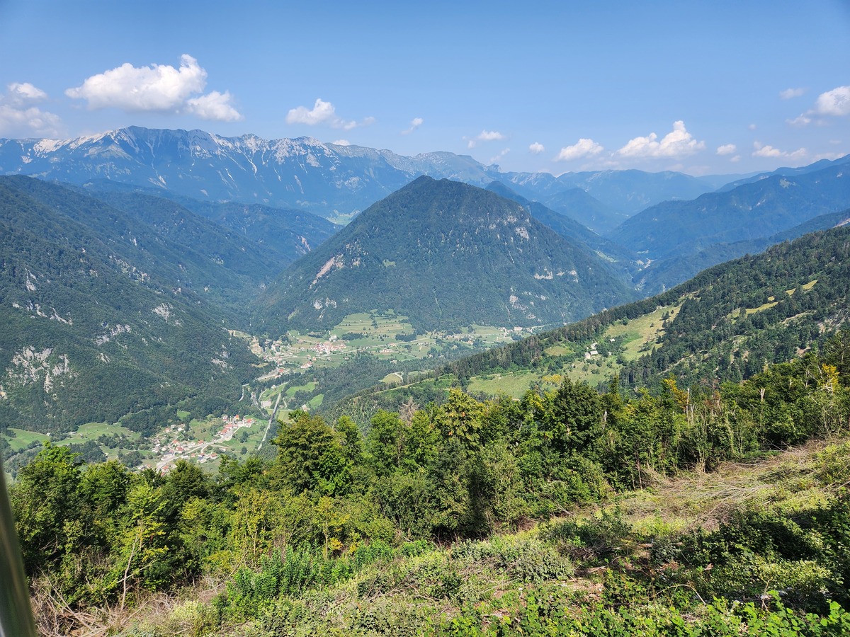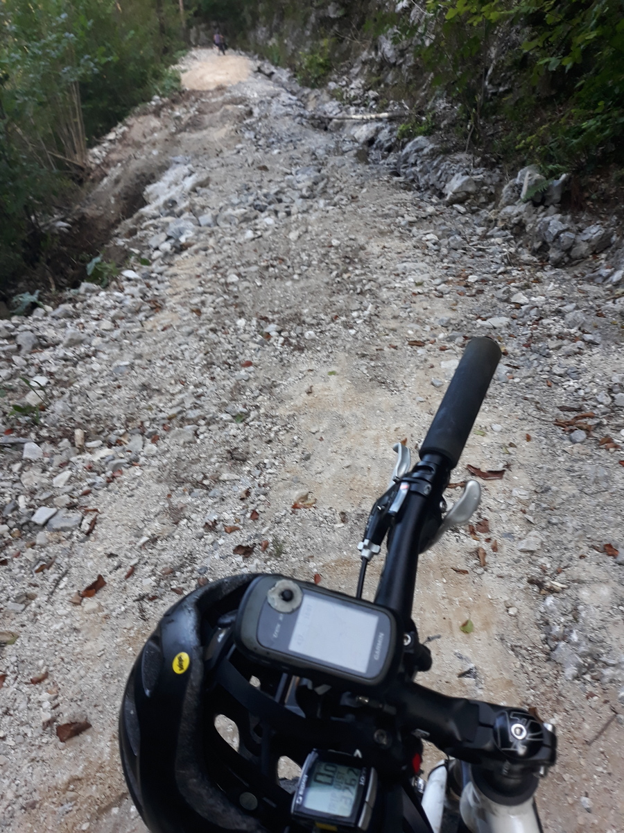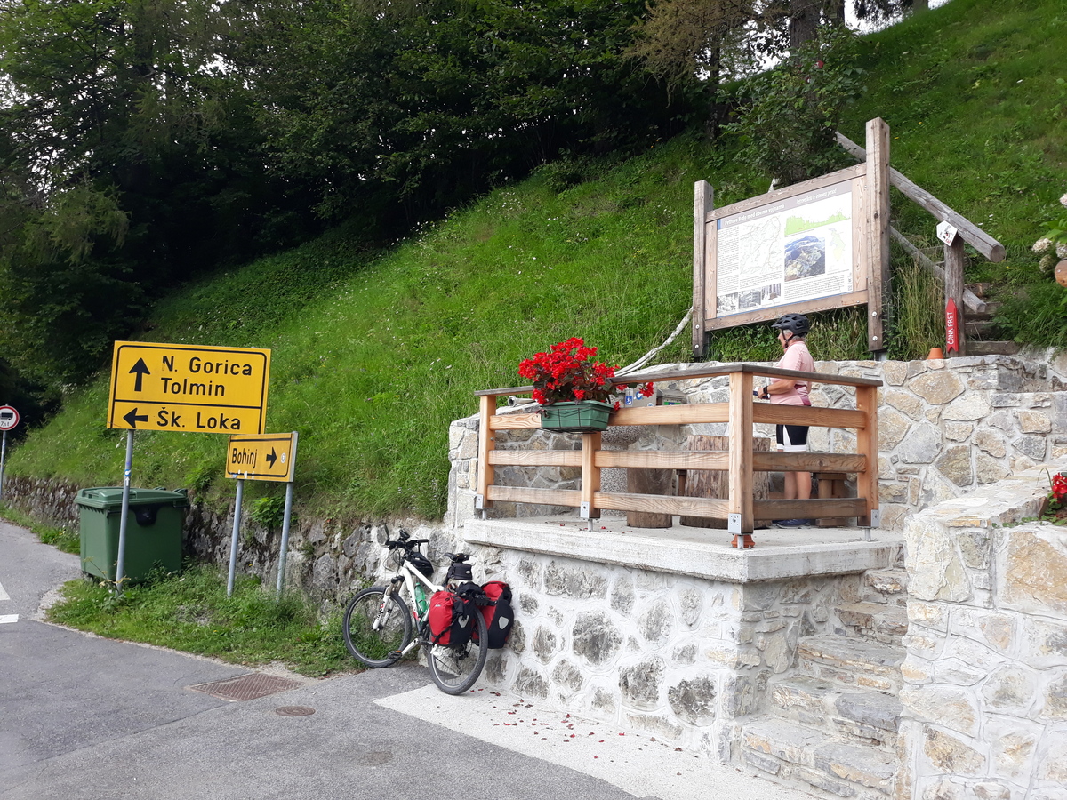 Vršiška cesta res ni posebej prijetna, a ni bilo prav veliko avtomobilov in še ti so bili obzirni do kolesarjev, teh pa je bilo res veliko. Vseeno pa sva bila prav vesela, ko sva pri Tonkini koči zavila na staro vršiško cesto. Ta naju je ob lepih razgledih pripeljala do Poštarske koče. Sledil je lep in hiter spust po cesti v Trento.