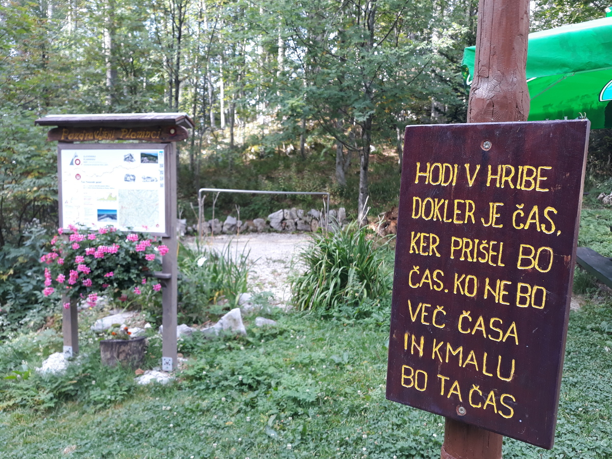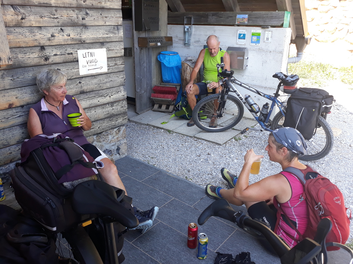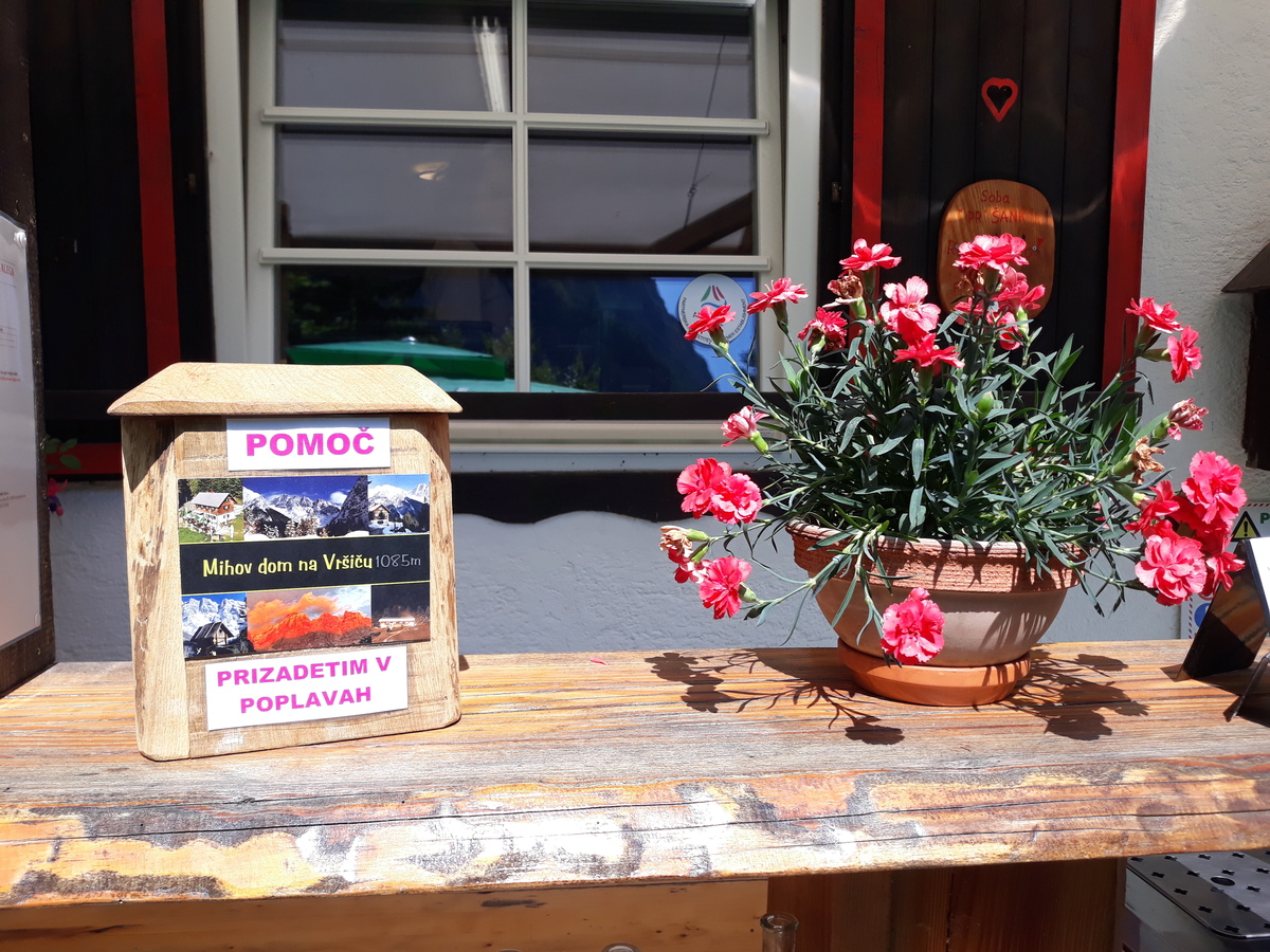 Zjutraj sva pospravila še vlažno opremo in odkolesarila proti Vršiču. Za pot do Mihovega doma sva izkoristila gozdno cesto ob Veliki Pišnici. Pri Mihovem domu sva darovala prispevek za poplavljence. Vsakemu gostu so namreč podarili razglednico s komentarjem, da je to njihov prispevek za sanacijo škode po poplavah, mi pa se lahko odločimo kakor hočemo in ob tem pokazali na škatlo s prostovoljnimi prispevki.
