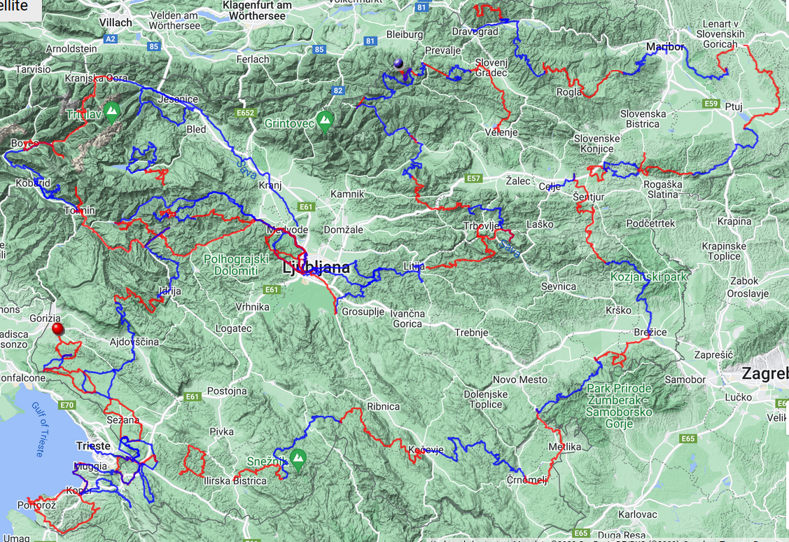 Po 3500 kilometrih in 73 000 višinskih metrih vzpona se je z vsemi ovinki in zankami formalno končalo najino kolesarjenje po Slovenski turno kolesarski poti (STKP). Od tega sva v letu 2023 prevozila 2900 kilometrov in naredila 63 000 višinskih metrov. To je prikazano na sliki, kjer so etape praviloma označene z različnima barvama.